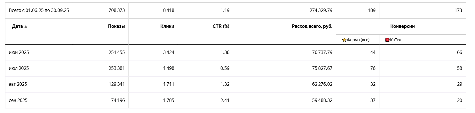 Итого: 274 329 ₽ / 362 заявки = 757 ₽/заявка
